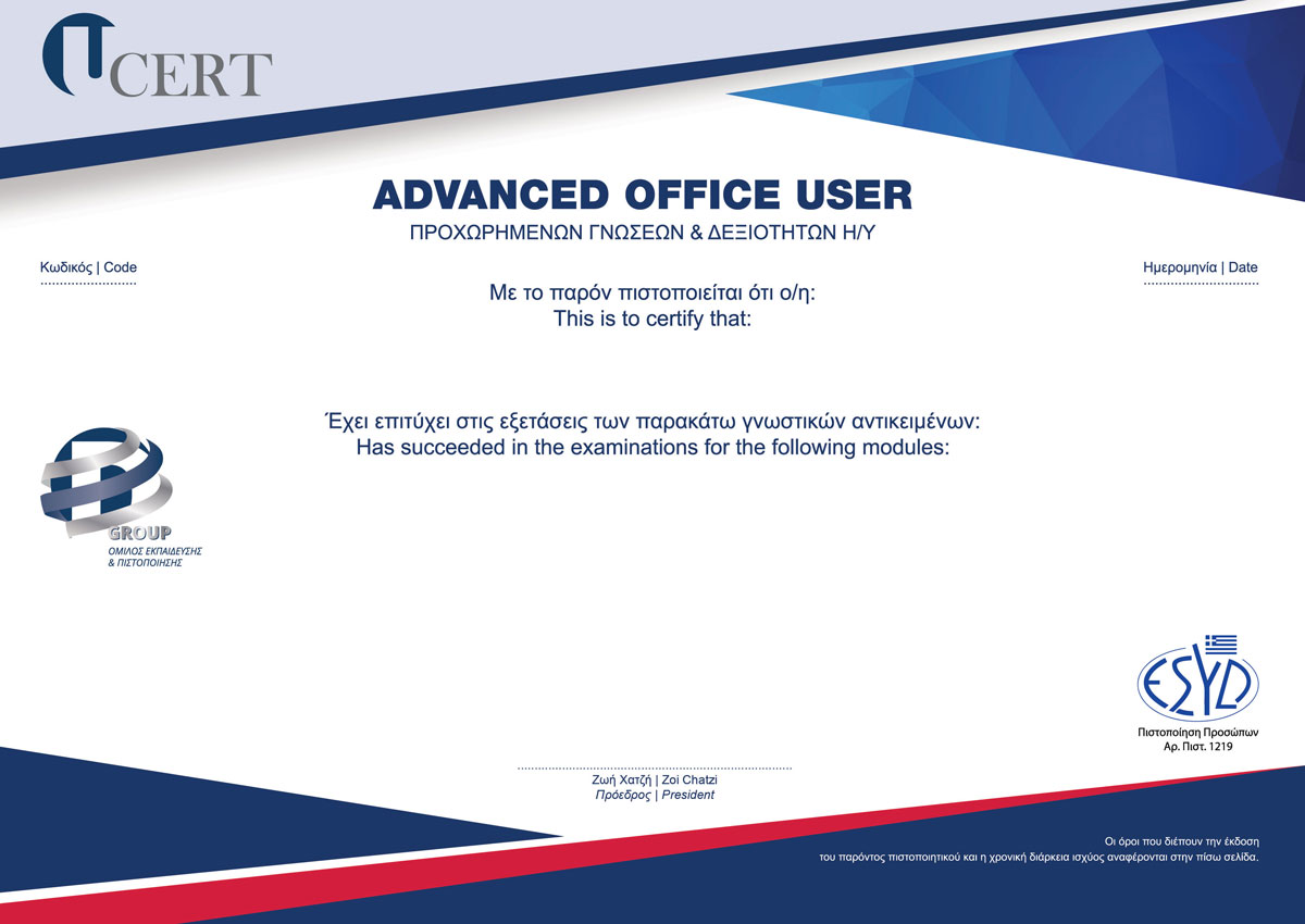Tα πιστοποιητικό    Advanced Office User είναι διαπιστευμένο από το Ε.ΣΥ.Δ., σύμφωνα με το διεθνές πρότυπο ISO/IEC 17024:2012, γεγονός που το καθιστά ένα ευρέως αποδεκτό πιστοποιητικό από τις χώρες – μέλη της Ευρωπαϊκής Ένωσης και γενικώς τις χώρες που έχουν υιοθετήσει τα διεθνή πρότυπα πιστοποίησης.