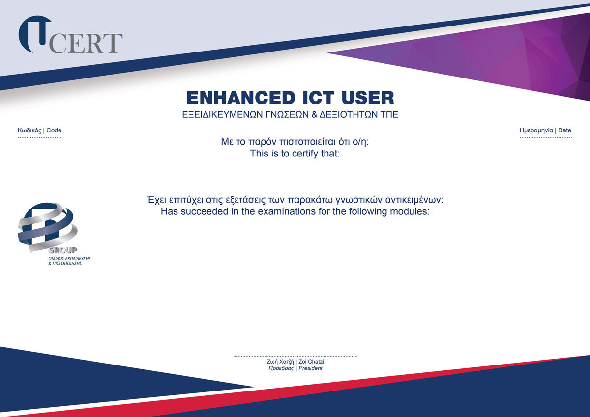 Το πιστοποιητικό UCERT Enhanced ICT User αποτελεί ένα ουσιαστικό εφόδιο εκείνων που επιθυμούν να συμπεριλάβουν στο βιογραφικό τους ένα ανταγωνιστικό πλεονέκτημα στο σύγχρονο στίβο εργασίας, σε στελέχη εταιριών και επιχειρήσεων που οι διοικήσεις τους έθεσαν υψηλά πρότυπα γνώσεων, καθώς και σε όσους επιθυμούν να αποδείξουν γνώσεις εξειδικευμένων προγραμμάτων και εφαρμογών