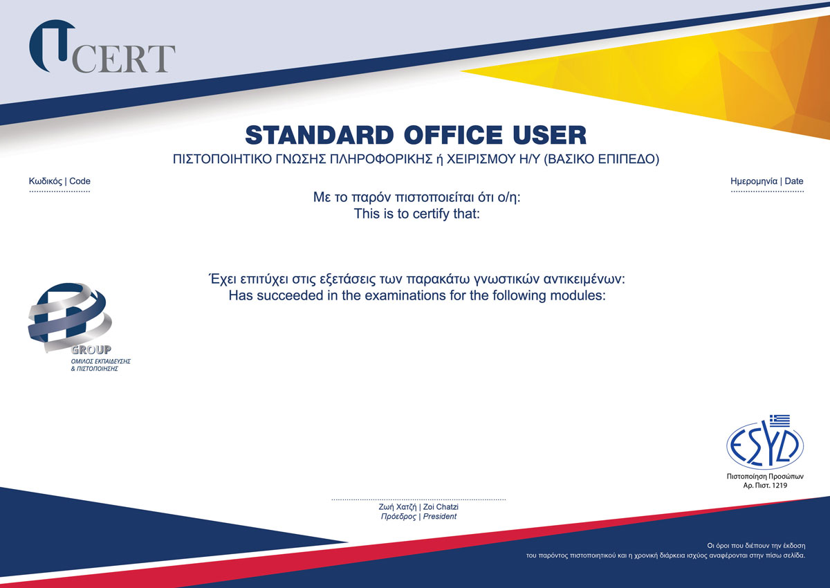 Το πιστοποιητικό Standard Office User είναι αναγνωρισμένο από τον Ε.Ο.Π.Π.Ε.Π. και αποδεκτό από το Α.Σ.Ε.Π. για πρόσληψη αλλά και κάθε μεταβολή στο Ελληνικό Δημόσιο. Είναι διαπιστευμένο από το Ε.ΣΥ.Δ., σύμφωνα με το διεθνές πρότυπο ISO/IEC 17024:2012, γεγονός που το καθιστά ένα ευρέως αποδεκτό πιστοποιητικό από τις χώρες – μέλη της Ευρωπαϊκής Ένωσης και γενικώς τις χώρες που έχουν υιοθετήσει τα διεθνή πρότυπα πιστοποίησης. Με την απόκτηση του πιστοποιητικού Standard Office User ο κάτοχός του αποδεικνύει τη γνώση χειρισμού του πακέτου αυτοματισμού γραφείου Microsoft Office σε βασικό επίπεδο.